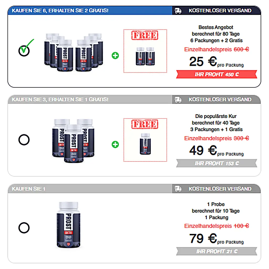 Aus diesem Grund empfehlen wir nicht, ProstAktiv über Plattformen wie Amazon, Walmart oder eBay zu kaufen, da Herkunft und Qualität dieser Produkte nicht garantiert werden können. In einigen Fällen können sie andere Inhaltsstoffe enthalten oder nicht den ursprünglichen Standards entsprechen, was potenzielle Risiken mit sich bringen kann.